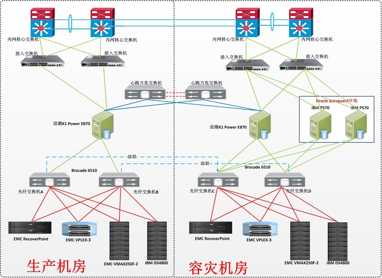 存儲(chǔ)層面上,采用現(xiàn)今主主流的存儲(chǔ)雙活技術(shù),在醫(yī)院生產(chǎn)及容災(zāi)的兩個(gè)機(jī)房,分別放置一套 EMC VPLEX 雙活網(wǎng)關(guān)及 EMC VMAX 250F 全閃存儲(chǔ),形成雙活集群。存儲(chǔ)配置高速 SSD 磁盤(pán),為業(yè)務(wù)提供高 IOPS 。每個(gè)機(jī)房放置一套 EMC RecoverPoint 并使用原來(lái)生產(chǎn)存儲(chǔ) IBM DS4800 作為其存儲(chǔ)空間,提供實(shí)時(shí)的數(shù)據(jù)保障,可提供任意時(shí)間點(diǎn)的、 IO 級(jí)、秒級(jí)的恢復(fù)保障,彌補(bǔ)了原來(lái)容災(zāi)架構(gòu)的不足,可應(yīng)對(duì)物理部件故障及邏輯故障等多重風(fēng)險(xiǎn)。