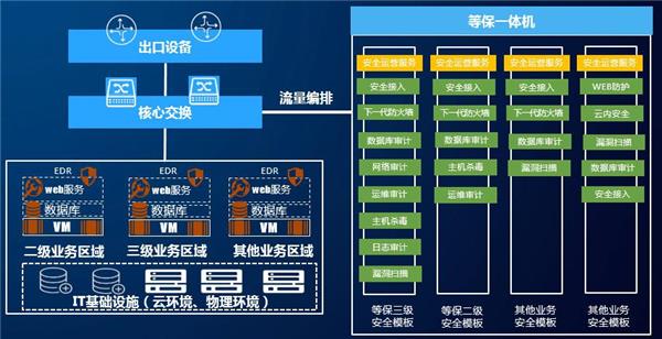 等保一體機中已預設好基礎合規(guī)模板及增強合規(guī)模板,在用戶數(shù)據(jù)中心旁路部署等保一體機,根據(jù)用戶業(yè)務系統(tǒng)的合規(guī)需求,按需使用相關模板及其他相關自定義安全組件,即可實現(xiàn)等級保護安全加固拓撲的快速編排和交付。